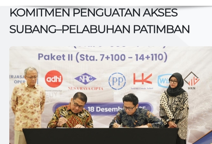 Subang, Arus barang dari kawasan industri menuju Pelabuhan Patimban kian dekat ke tahap penguatan infrastruktur. PT Perumahan Pembangunan (PTPP) Persero, Tbk menandatangani kontrak pekerjaan konstruksi Jalan Tol Akses Patimban Paket II bersama PT Jasamarga Akses Patimban pada Kamis (18/12/2025) di Kabupaten Subang, Jawa Barat.